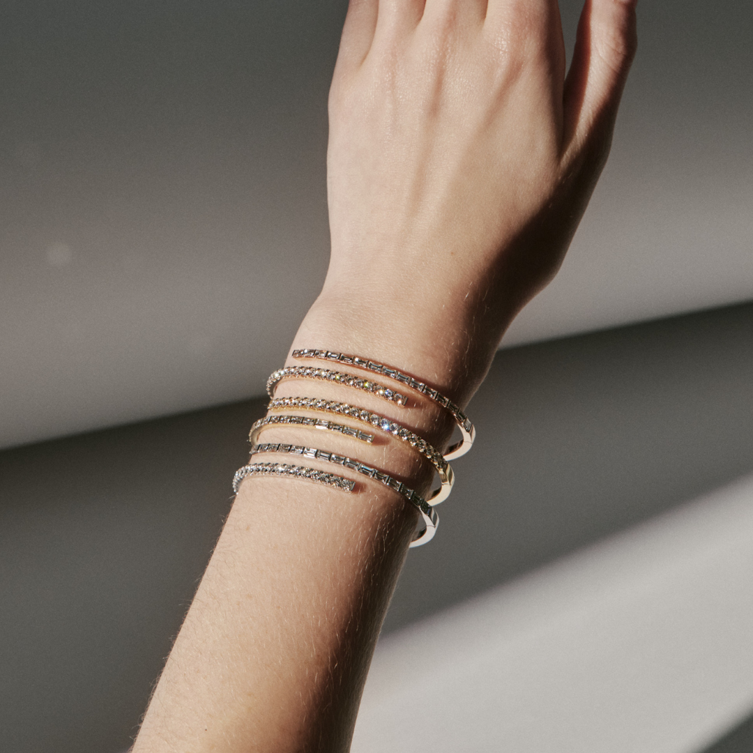 A signature design, the ECLIPSE Diamond Bangle showcases a striking contrast of brilliant and baguette-cut diamonds, perfectly balancing elegance and innovation within a classic and modern silhouette.